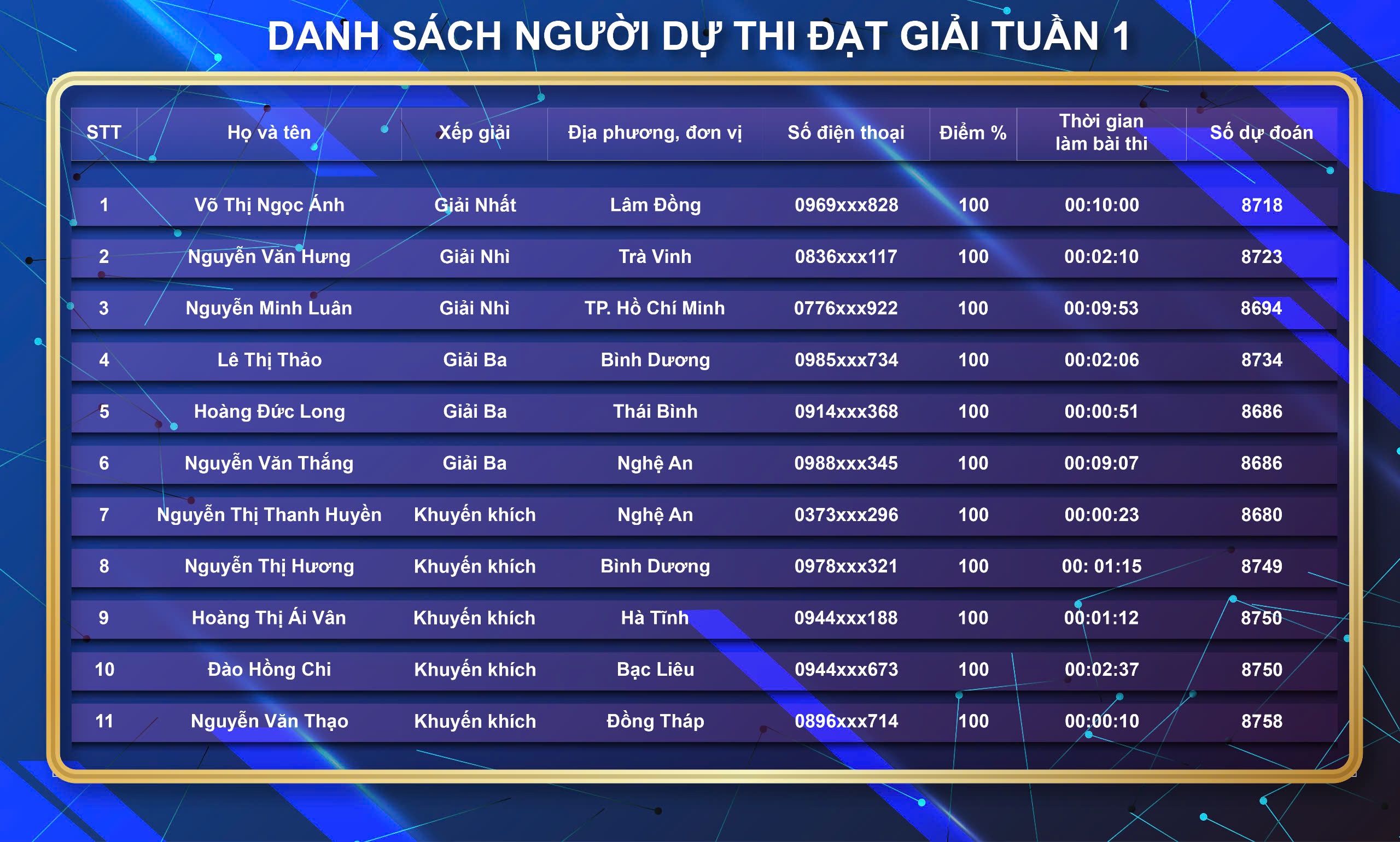 Căn cứ vào Thể lệ Cuộc thi, đối chiếu các tiêu chí xét giải thưởng (trả lời đúng tất cả 10 câu hỏi trắc nghiệm tại mỗi lượt dự thi; dự đoán đúng hoặc gần đúng nhất số lượt người dự thi trả lời đúng 10 câu hỏi trắc nghiệm (tại tuần thi đó); có thời gian hoàn thành bài thi ít nhất tại lượt thi được xét), Ban Tổ chức Cuộc thi công bố danh sách cá nhân đạt giải thi trên Trang Thông tin điện tử tổng hợp Báo cáo viên (01 giải Nhất, 02 giải Nhì, 03 giải Ba và 5 giải Khuyến khích) như sau: