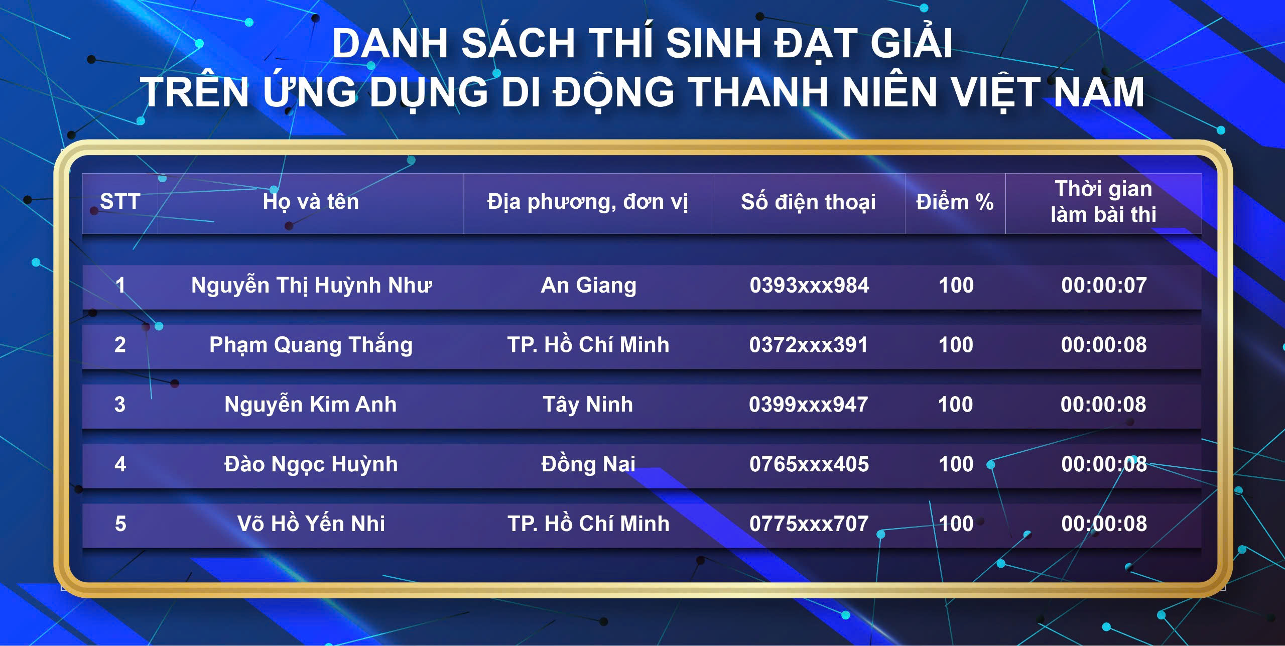 Danh sách các cá nhân đạt giải thi trên Ứng dụng di động Thanh niên Việt Nam như sau: